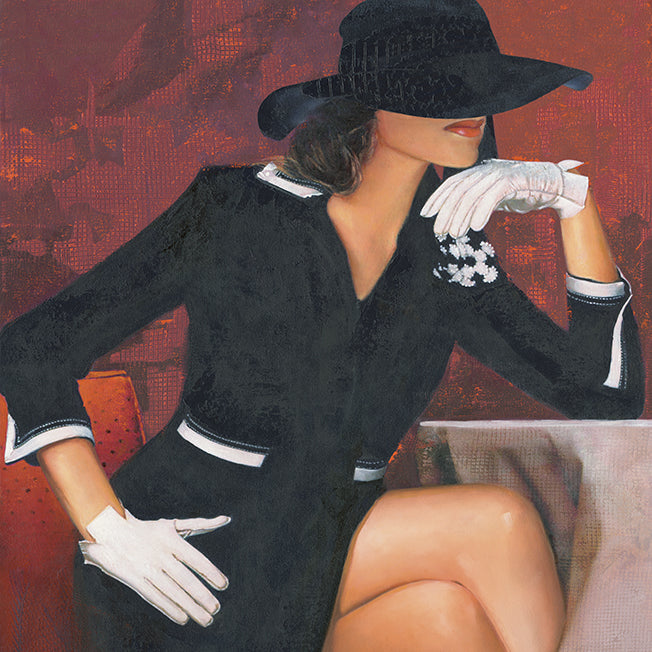 Keywords: Orientation Square: figurative, fashion, lady in black dress and hat sitting at a table. lady wearing white gloves, red, black, white