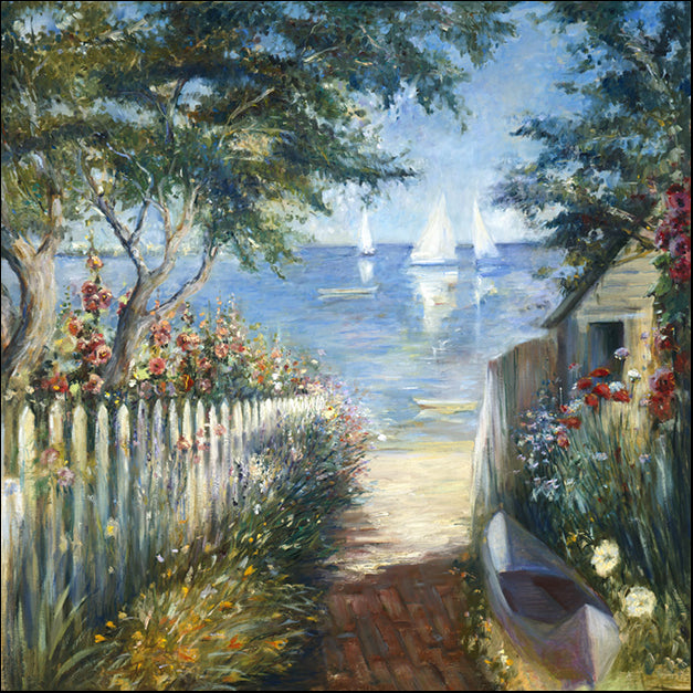 Keywords: Orientation Square: seascape, coastal, marine, beach, landcape, contemporary, impressionism, boats, house, beige, yellow, green, blue, white, purple, grey, brown, red, orange