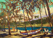 Keywords: Orientation Landscape (horizontal): seascape, coastal, beach, marine, ocean, tropical, boat, figures, palm trees, red, yellow, orange, green, blue, purple, brown, beige, cream