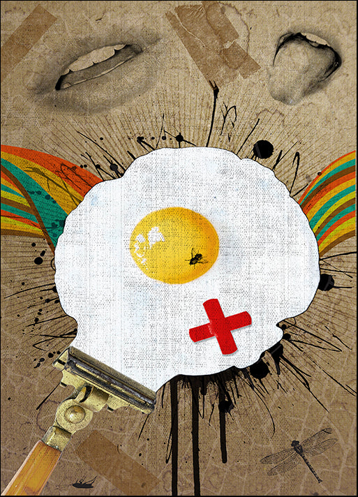 Keywords: Orientation Portrait (vertical): figurative, whimsical, surrealism, food, egg, brown, sepia, white, yellow, red, black, orange, green, black