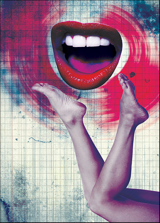 Keywords: Orientation Portrait (vertical): figurative, whimsical, surrealism, legs, lips, grid, red, white, pink, grey