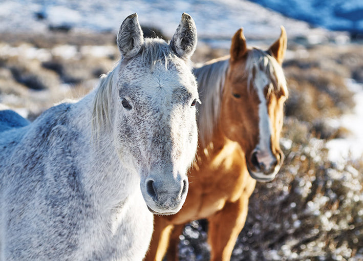 Keywords: Orientation Landscape (horizontal): photography, animal, horse, landscape, snow, trees, white, black, grey, brown, beige