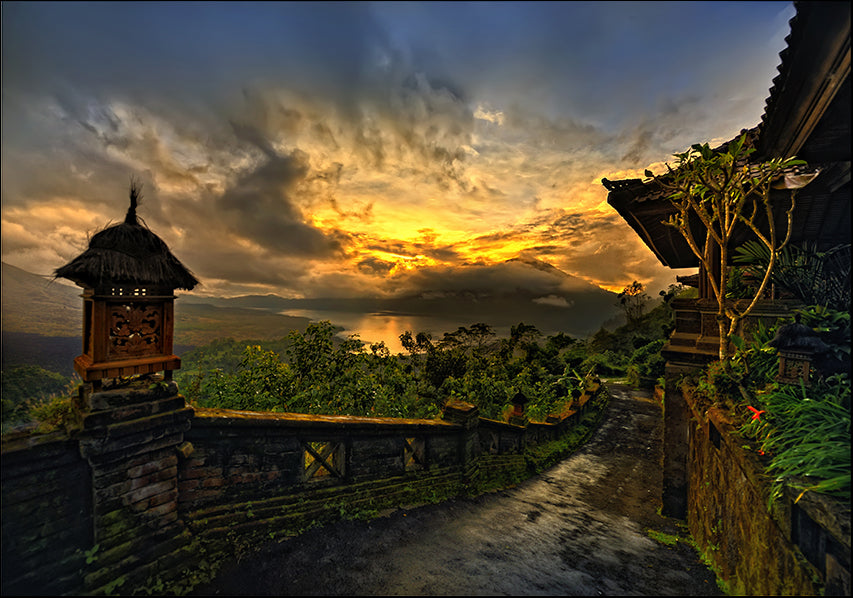 Keywords: Sunset photograph from Bali Indonesia, golden blue clouds and old building with path looking at a landscape