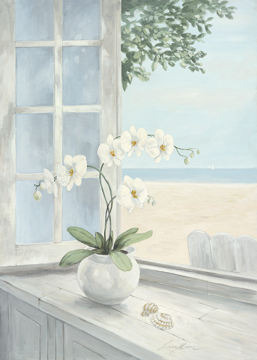 Keywords: Orientation portrait vertical, seaview, beach, sand, flowers in a vase on a window seal, blue, green, grey, white, coastal, tropical, floral, flowers, seascape, ocean, still life, seashells