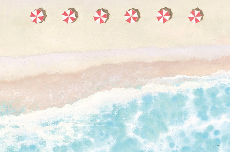Capture the vibrant, sun-drenched spirit of the coast with "Sky Seaview I." In this playful and energetic piece, acclaimed artist James Wiens offers a unique bird's-eye perspective of a perfect beach day. Using a bright, painterly style, he depicts a row of cheerful red-and-white striped umbrellas lining a pristine stretch of sandy shore, set against the rhythmic, swirling turquoise of the Atlantic tide.