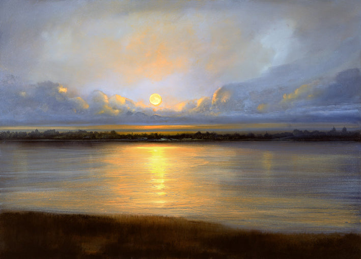 Keywords: Orientation Landscape (horizontal): landscape, contemporary, lake, sunset, reflections, trees, yellow, orange, purple, blue, brown, green, grey