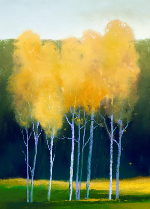 Keywords: Orientation Portrait (vertical): landscape, forest, contemporary, impressionism, tree, blue, orange, yellow, green, brown, beige, grey