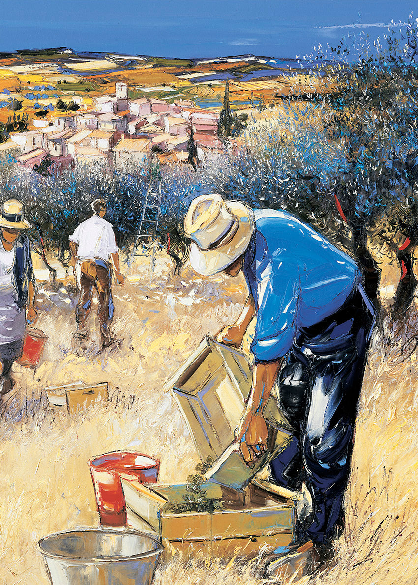 Keywords: Orientation Vertical: men, old men, lady, woman, hats, caps, village life, hats, farming, olive trees, town, houses, homes, buildings, grass, hay, buckets, ladder, wooden boxes, picking olives, land, farm
