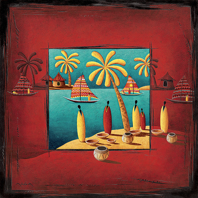 Keywords: Orientation Square: contemporary, people on an island, figurative, island, coastal, palm trees, sail boats, huts, water, teal, red, gold