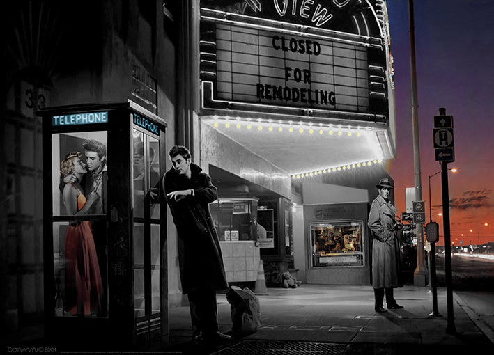 Keywords: Orientation Landscape (horizontal): celebrity, celebrities, Elvis, Marilyn Monroe, James Dean, Humphrey Bogart, people, man, woman, figurative, street scene, cinema, closed for remodeling, typography, phone booth, telephone, grey, black, red, orange, purple, green