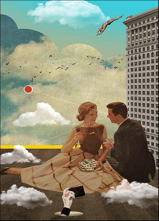 Keywords: Orientation Portrait (vertical): figurative, cityscape, whimsical, surrealism, animals, buildings, birds, grey, beige, black, white, red, brown, blue