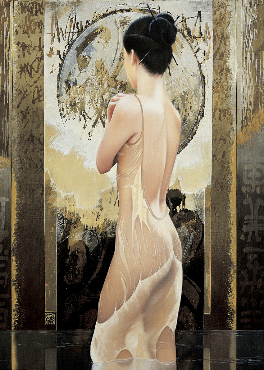 Keywords: person, female, lady, woman, see through dress, hair up, Japanese style,hair bun, hair sticks, Asian influence, woman standing, Asian characters, writing