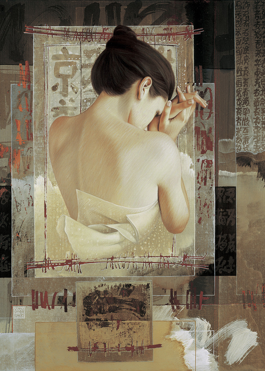 Keywords: person, female, lady, woman, see through dress, hair up, Japanese style,hair bun, , Asian influence, woman standing, Asian characters, writing, women thinking, deep in thought