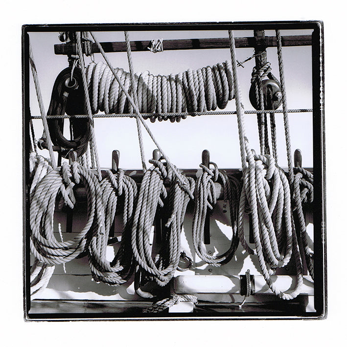 Keywords: Orientation Square: black & white, sea, ocean, water, boat, sail, mast, sailing, boat, yacht, ropes, travel sail boat pulleys, photo, photograph