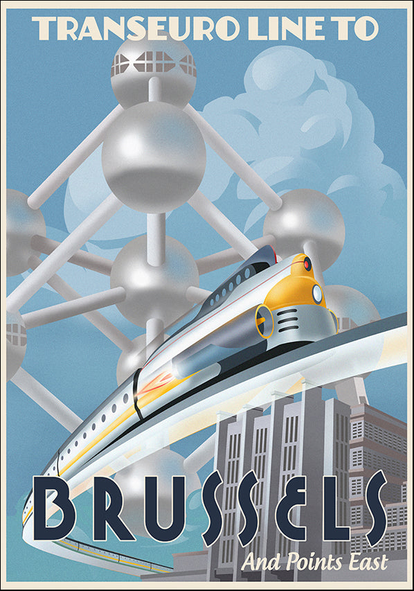 Keywords: Orientation portrait vertical, Vintage advertising, holiday destination, Transeuro line to Brussels and Points East. Transportation, train.
