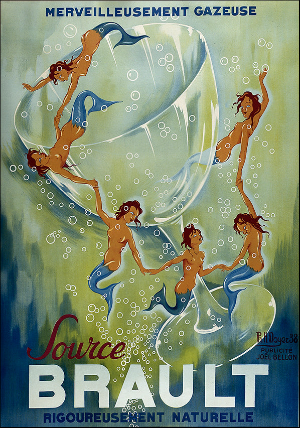 Keywords: Orientation portrait vertical : vintage, advertisement, typography, figurative, mermaids, merveilleusement gazeuse, Brault, rigoureusement naturelle, glass, blue, green