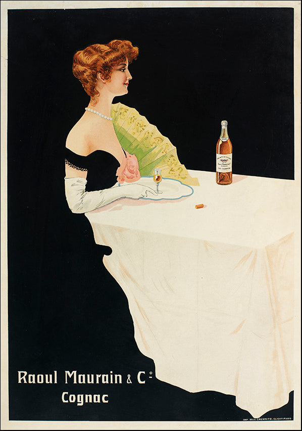 Keywords: Orientation portrait vertical : vintage, advertisement, typography, figurative, Raoul Maurain & Co Cognac, lady sitting down in black dress, black, green