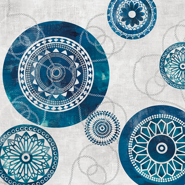 Keywords: Orientation Square: abstract design, whimsical, blue, indigo, shapes, chains,stars, flower, patterns, circles, rings
